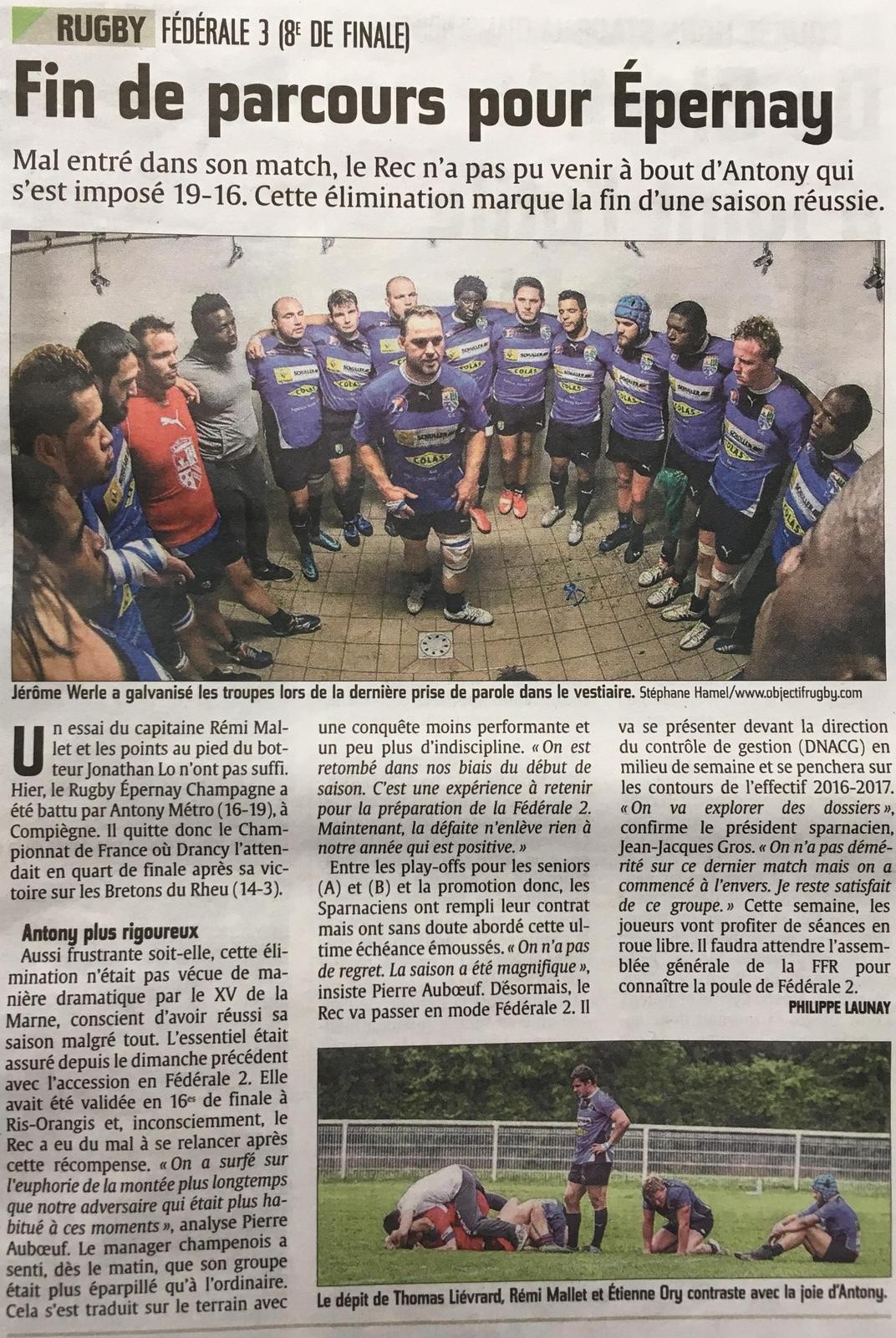 Evènement : Article au sujet du l'ascension du REC en fédérale 2 "Epernay reprend l'ascenseur".
