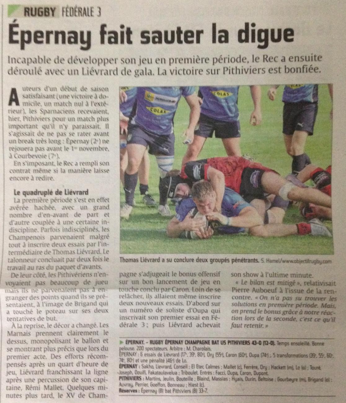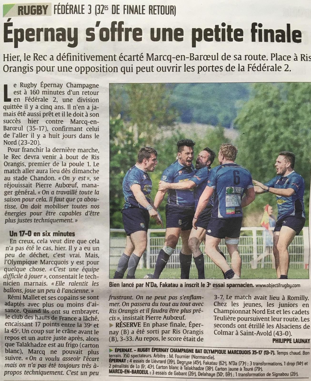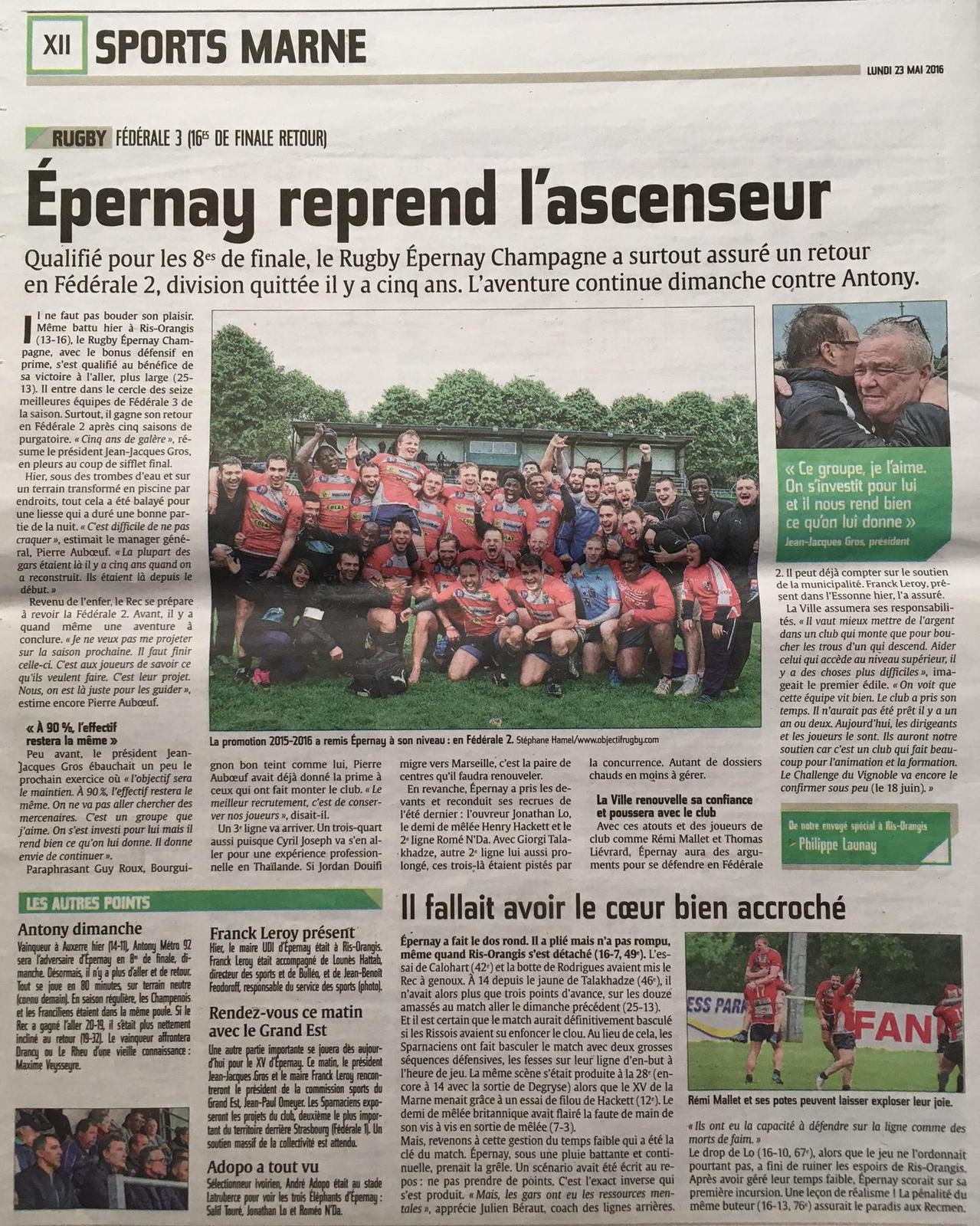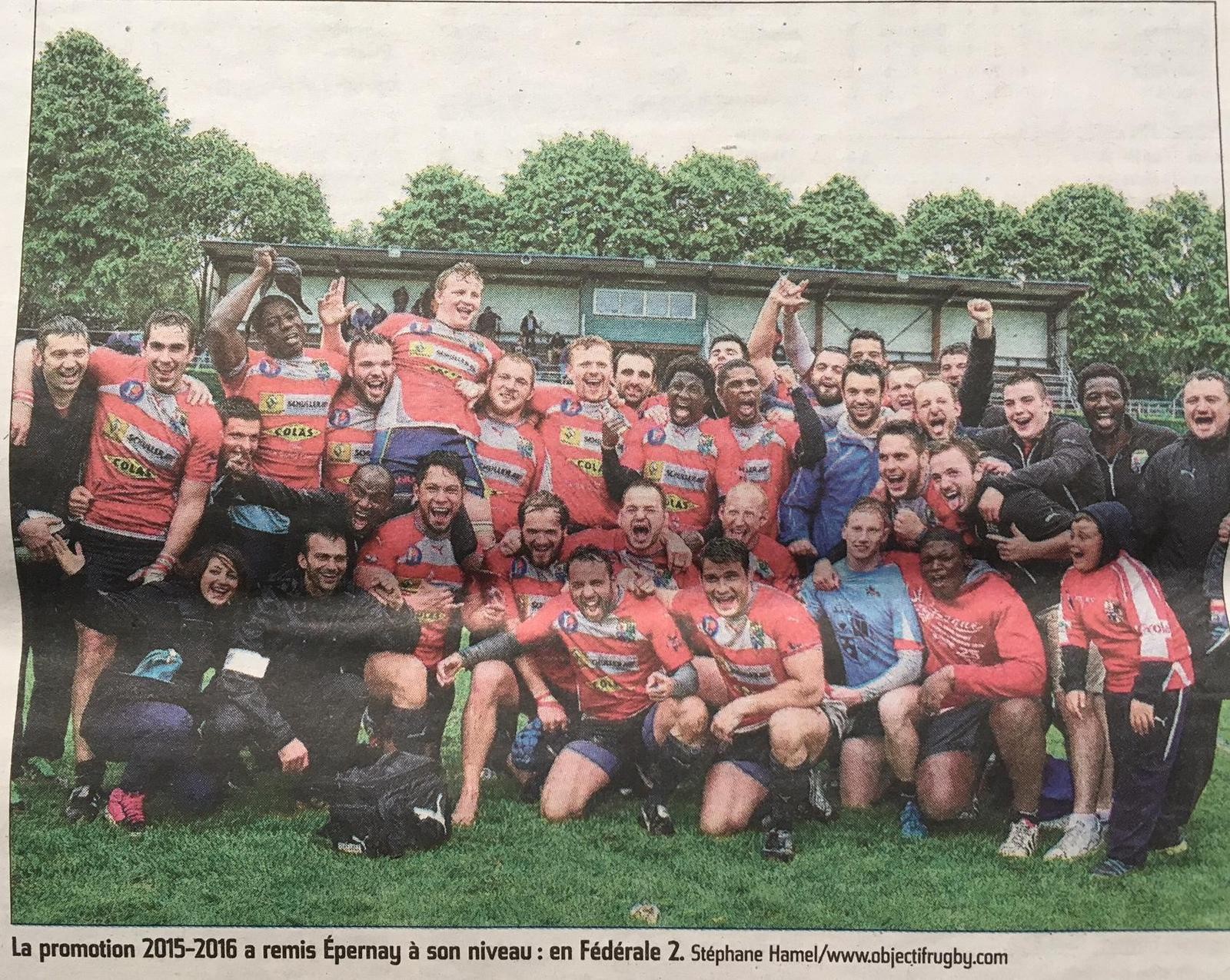 Evènement : Article au sujet du l'ascension du REC en fédérale 2 "Epernay reprend l'ascenseur".